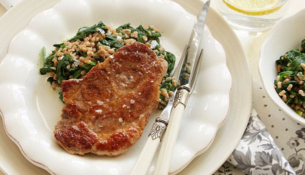 Få opskriften på en lækker omgang aftensmad bestående af røde korteletter og salat med perlebyg. Velbekomme!