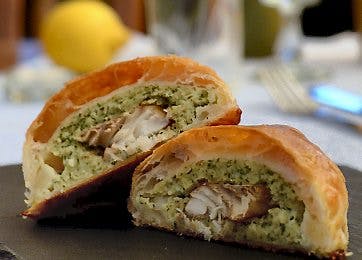 Lone Landmands indbagte torsk med dild og skalotteløg er indbagt i både butterdej og fiskefars. Retten kan serveres som forret eller hovedret.