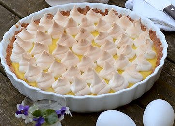 En flot tærte med mandler og makroner i bunden, en lækker og frisk citroncreme som fyld og på toppen små marengsdråber. Desserttærten er også velegnet på kaffebordet.