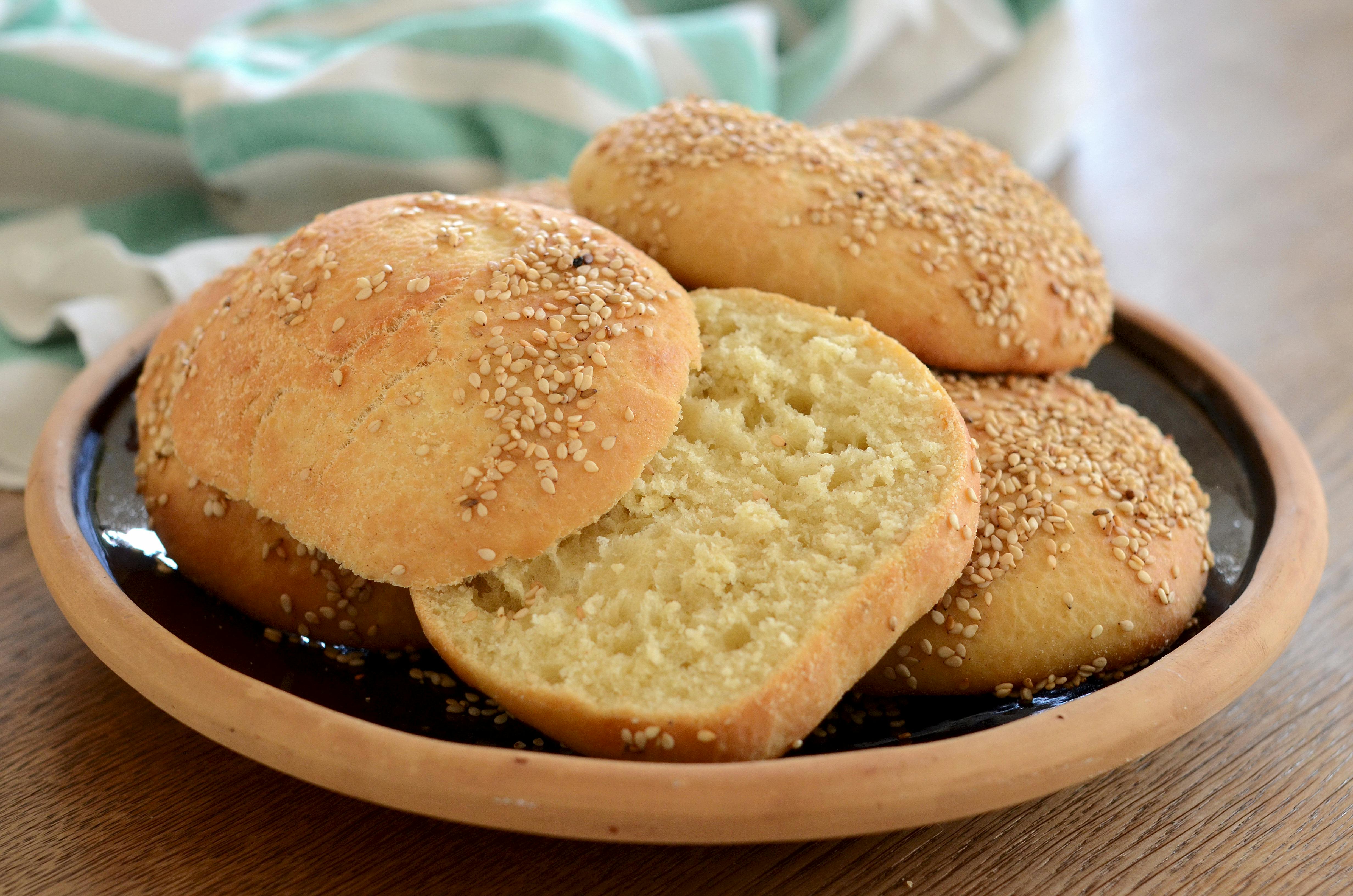 Langtidshævede burgerboller med durummel og drysset med sesamfrø