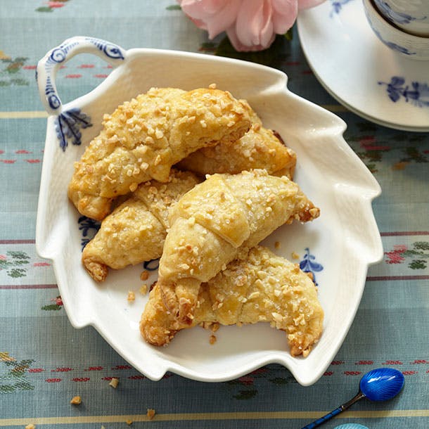 Disse kærnemælkshorn indeholder en lækker remonce og er drysset med perlesukker og hakkede mandler. Lige til kaffen!