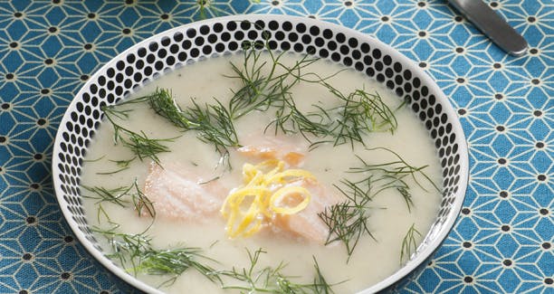 Kalorielet og velsmagende suppe med nærende fedtstoffer fra laksen og sunde kostfibre fra fennikel! Retten giver 4 portioner.