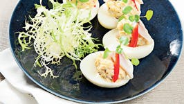 Nemme æg til påskefrokost med marinerede sild og fiskesennep