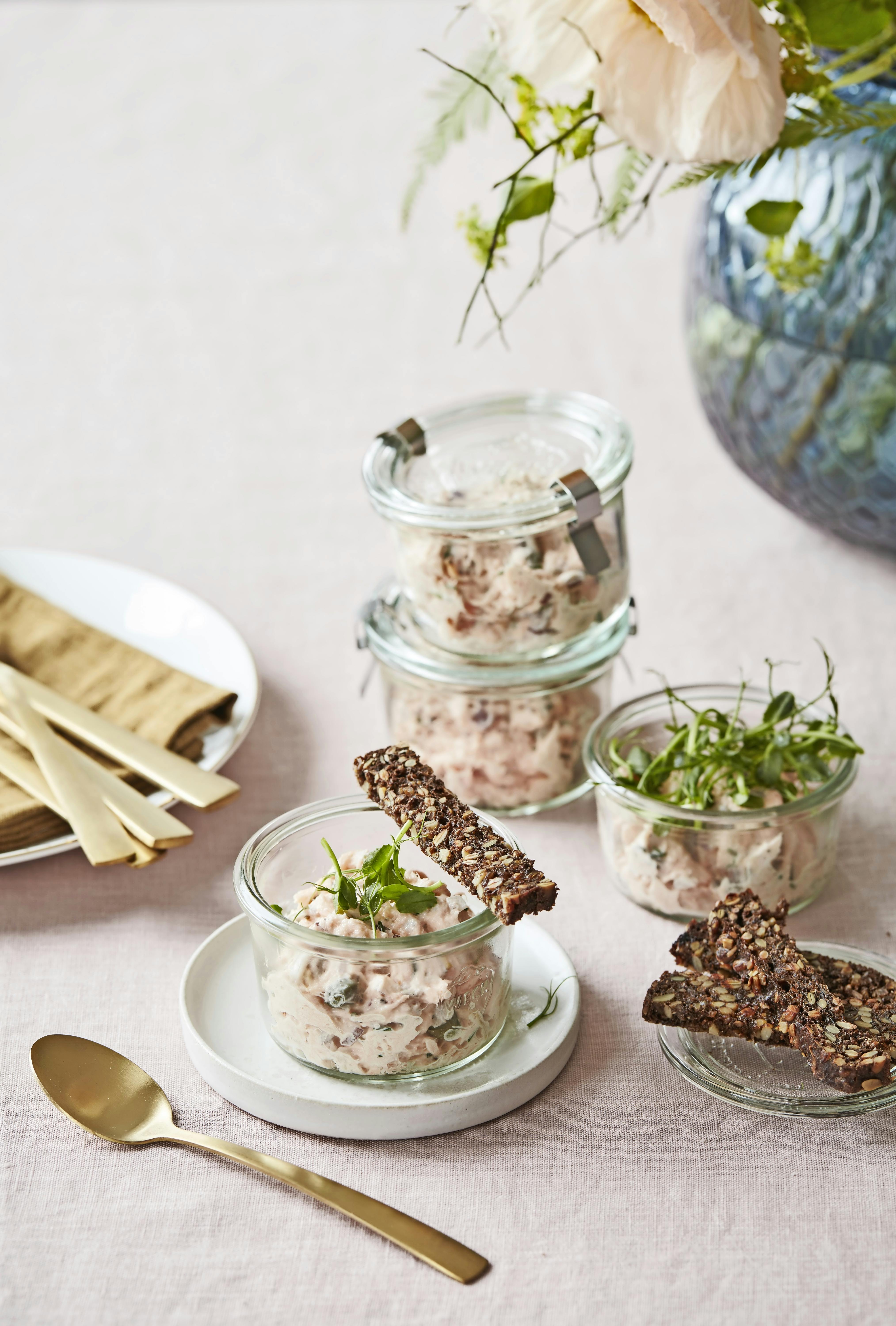 Opskrift på smagfuld forret: Lakserillette med ærteskud og ristet rugbrød
