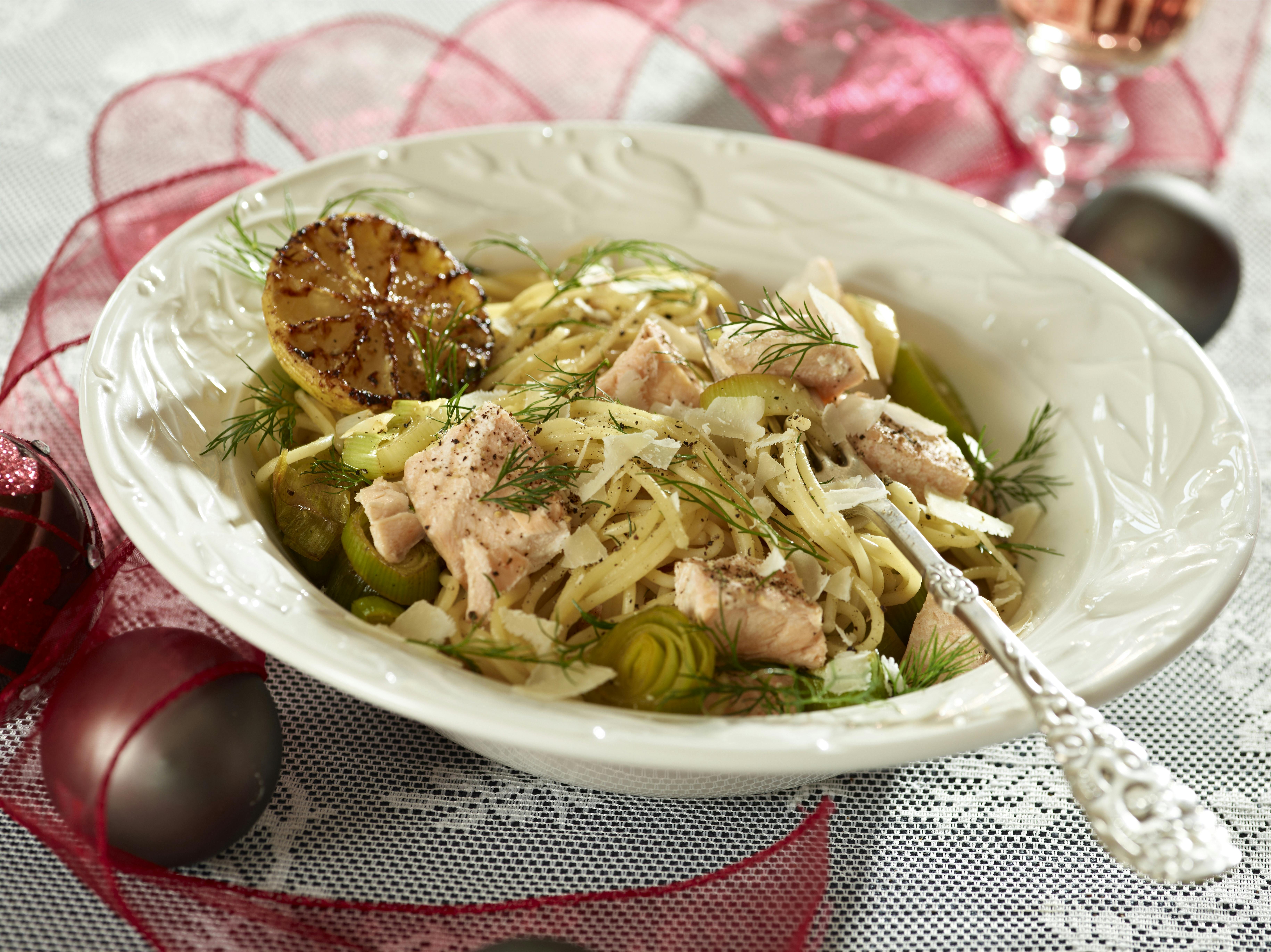 Dejlig middagsret med laksestykker og spaghetti vendt med citronstegte porrer og dild.