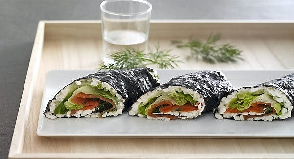Tangrulle med laks og salat tilhører kategorien PG - protein/grøntsager i Dukan-kuren. Retten er beregnet som en frokost til Dukankurens Fase 2 - Vekselfasen.