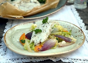 Den ovnbagte skrubbe bliver ekstra lækker og smager af meget mere, hvis du tilbereder fisken uden at fjerne benene. Servér den som her med gulerødder, kål, porre og løg eller vælg de grønsager, du synes bedst om.
