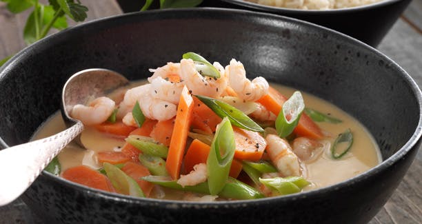 Rejer i kokosmælk med ris, gulerødder og forårsløg