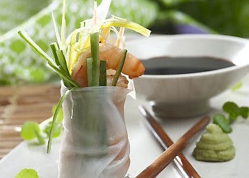 Eksotiske og slankende ruller fyldt med lækre rejer og sprøde grøntsager og serveret med sojasauce og wasabi.Rejer og andre skaldyr er noget af det bedste, du kan spise. De har et meget højt indhold af protein og intet fedt, og så er de rige på selen – et spormineral, som vi ofte får for lidt af, og som er en af de gode antioxidanter.