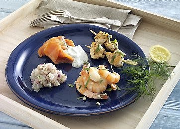 Tapas -tallerken med fisk, rejer og kylling til Dukan-kuren kan serveres dels som forret, dels som aftensmad.