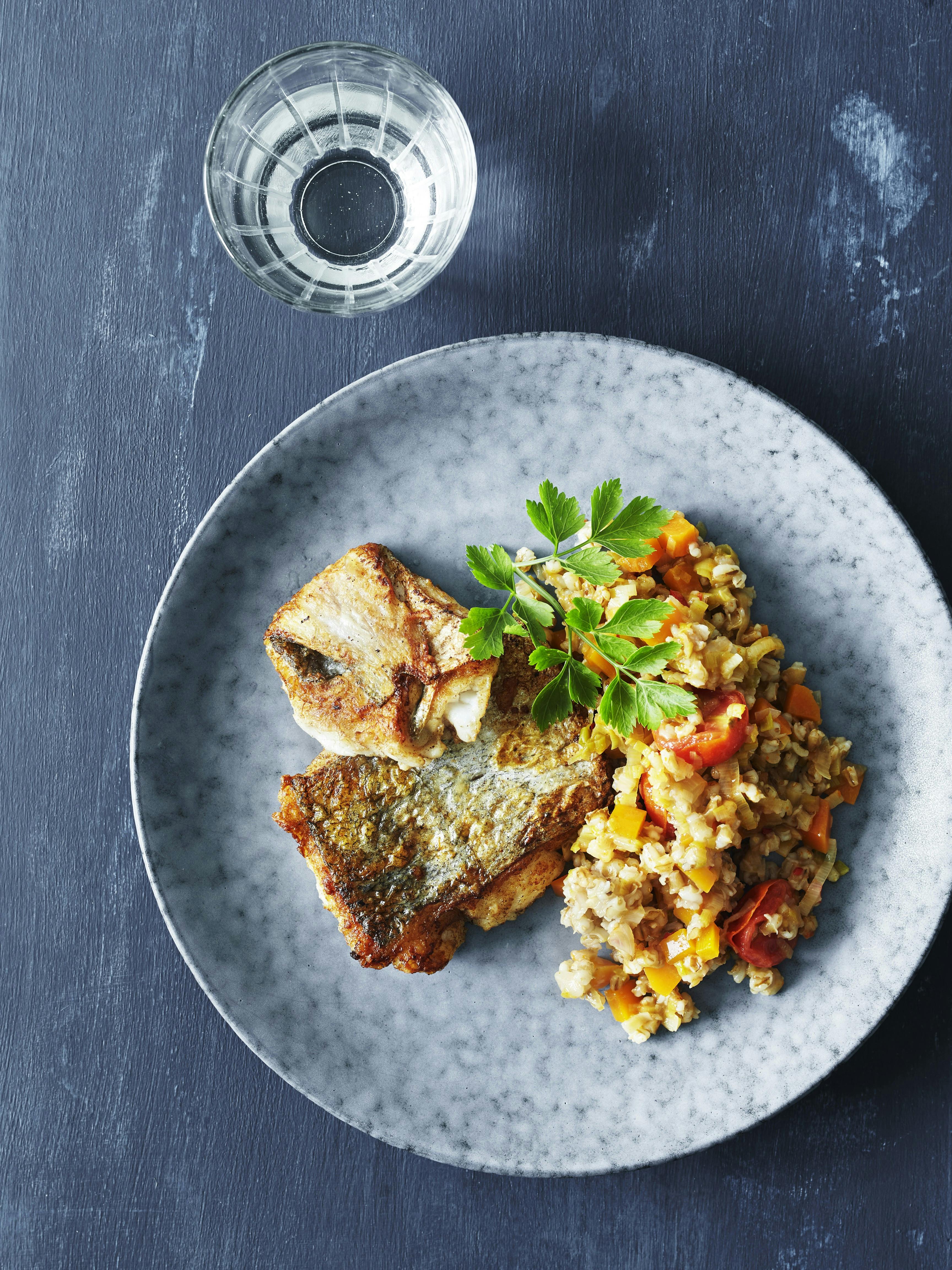 Skindstegt rødfisk med perlebyg er en delikat kombination af sprød fisk og fyldig tilbehør, der forkæler både smagsløg og sanser.
