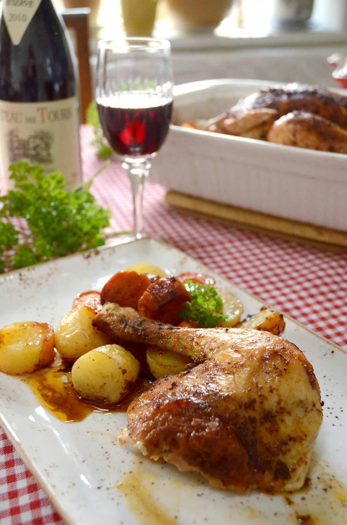 Kylling krydret med det sydamerikanske blandingskrydderi cajun, et krydderi med adskillige ingredienser, hvoraf røget paprika er det mest fremtrædende. Til retten serveres almindelige og søde, røde kartofler samt gulerødder i honning-balsamico-dressing.
