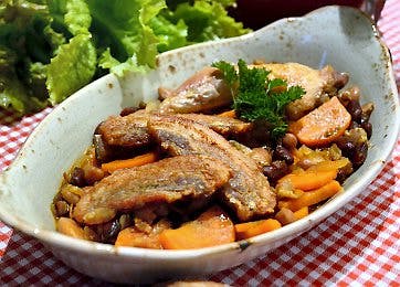 Denne danske udgave af cassoulet er tilberedt med kyllingelår, flæsk og bacon. Kødet lægges på en bund af bl.a. gulerødder og bønner, inden det hele kommer en tur i ovnen.