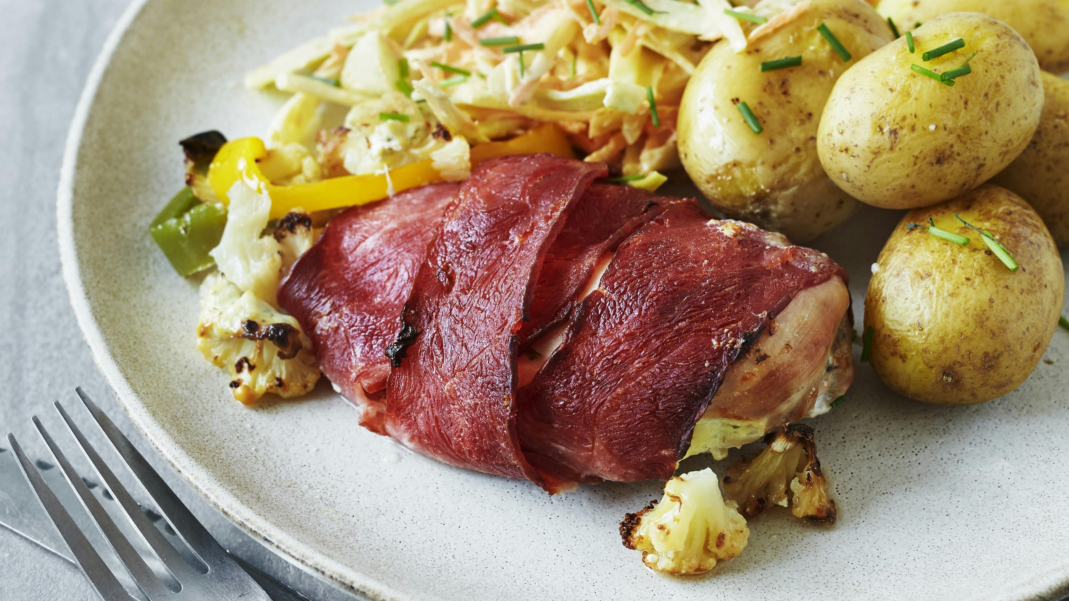 De saftige kyllingebryster er fyldt med cremet ost og svøbt i bacon, mens den sprøde og forfriskende coleslaw skaber en perfekt balance mellem smag og tekstur på tallerkenen.