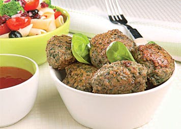 Til 4 personerFars:450 g hakket kyllingekød,2 fed hvidløg,250 g spinat,1 æg,1 dl havregryn,1½ tsk. salt, ½ tsk. peber,olie til stegning.Pastasalat:300