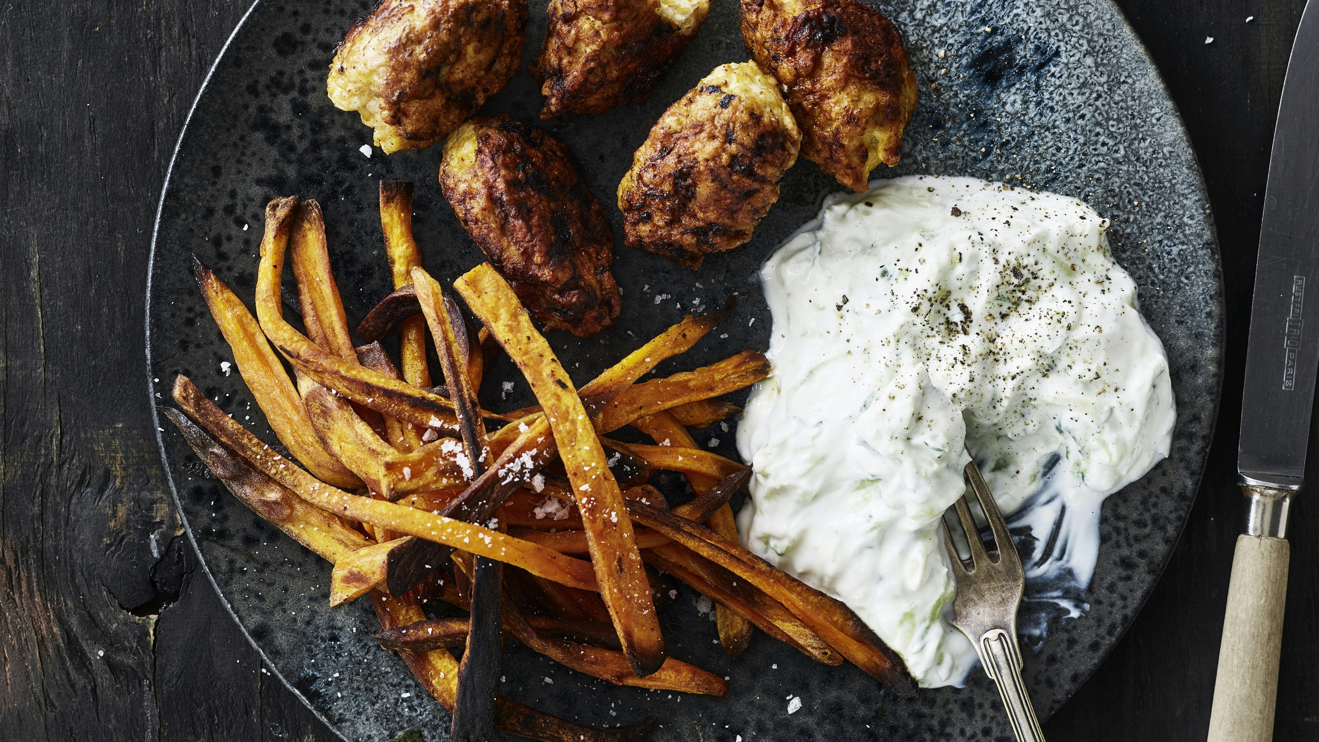 Lækre kyllingefrikadeller, der rækker til to portioner, som hver består af fem frikadeller med fritter og tzatziki.