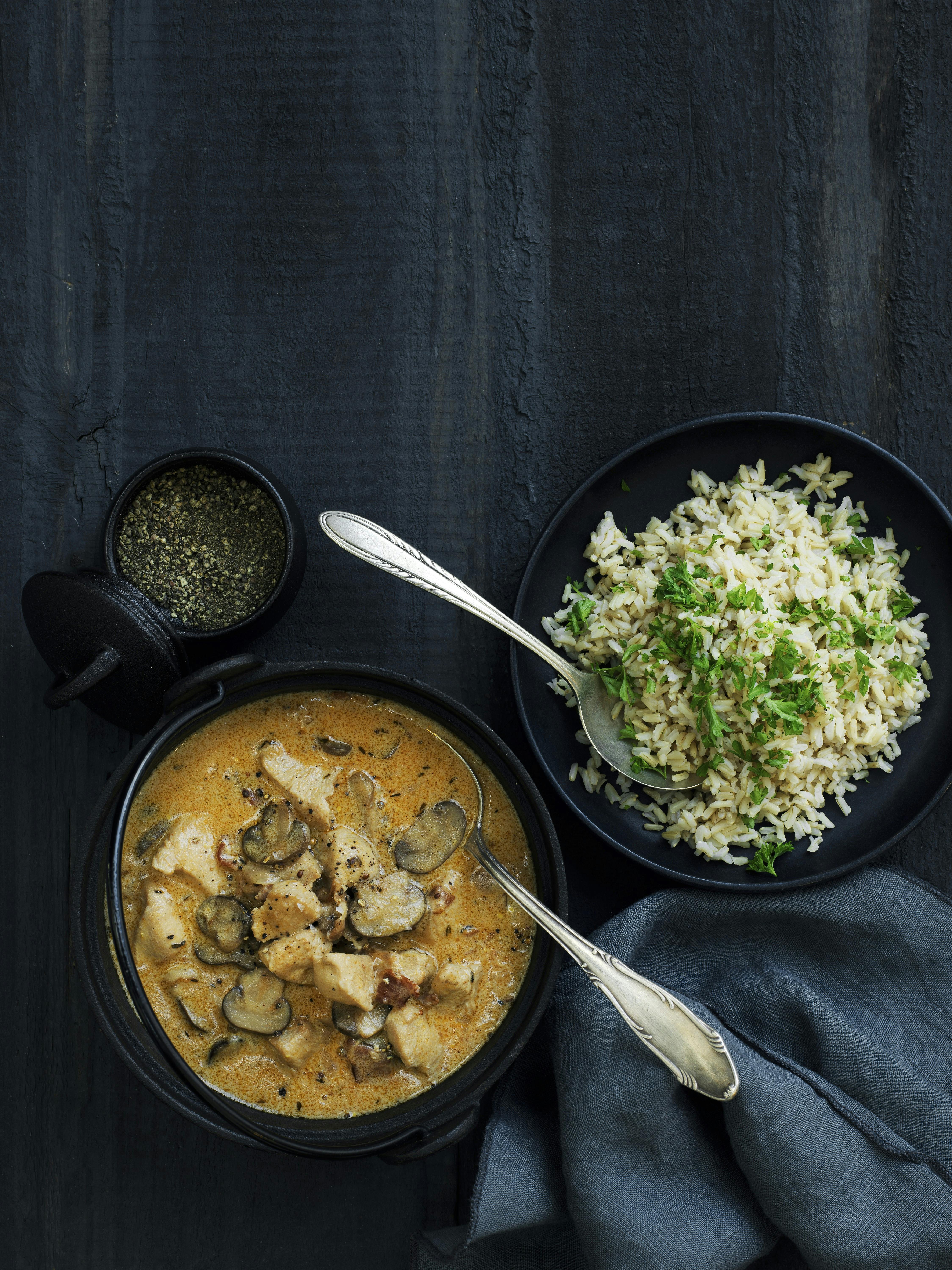 Opskrift på lækker hverdagsmad: Kylling stroganoff med rødløg, svampe og ris