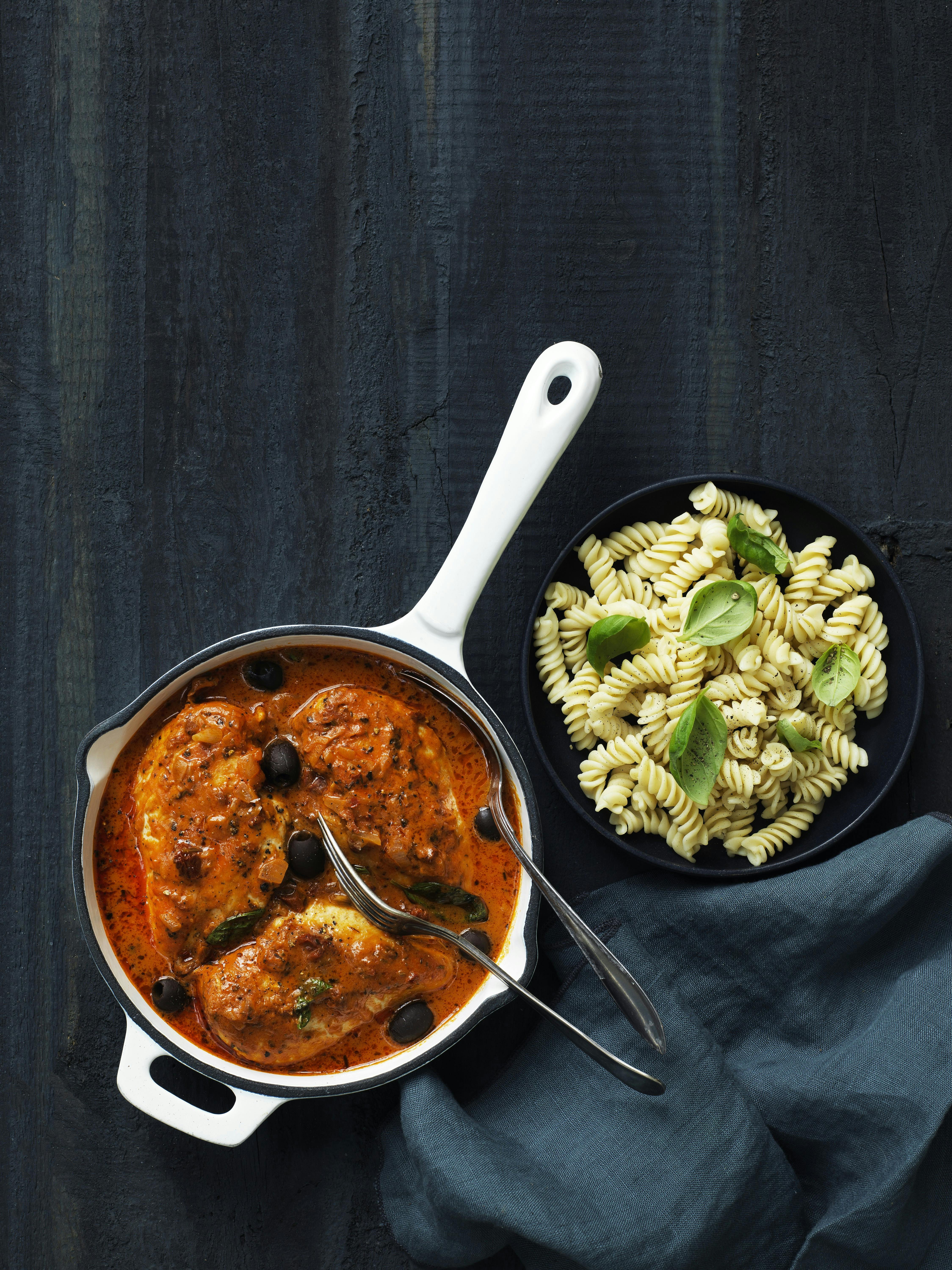 Cremet og smagfuld kylling i tomatsauce med pasta. Retten er perfekt til en travl hverdag, hvor det gerne må være nemt og lækkert.