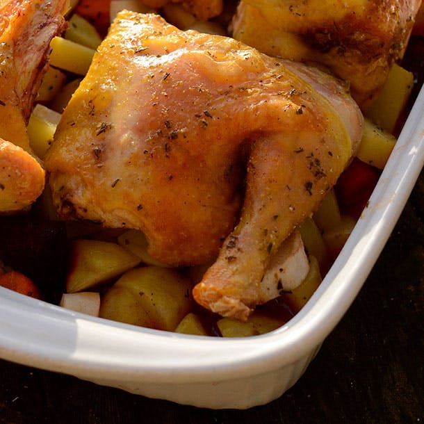 Den ovnstegte kylling er i denne opskrift stegt oven på et leje af rodfrugter. Det gør tilberedningen meget nemmere. Samtidig bevirker fugten fra rodfrugterne, at kyllingekødet holdes saftigt. Og den dejlige kyllingesaft giver rodfrugterne ekstra smag. Brug de rødder, vi foreslår her, eller brug dem, du synes bedst om.