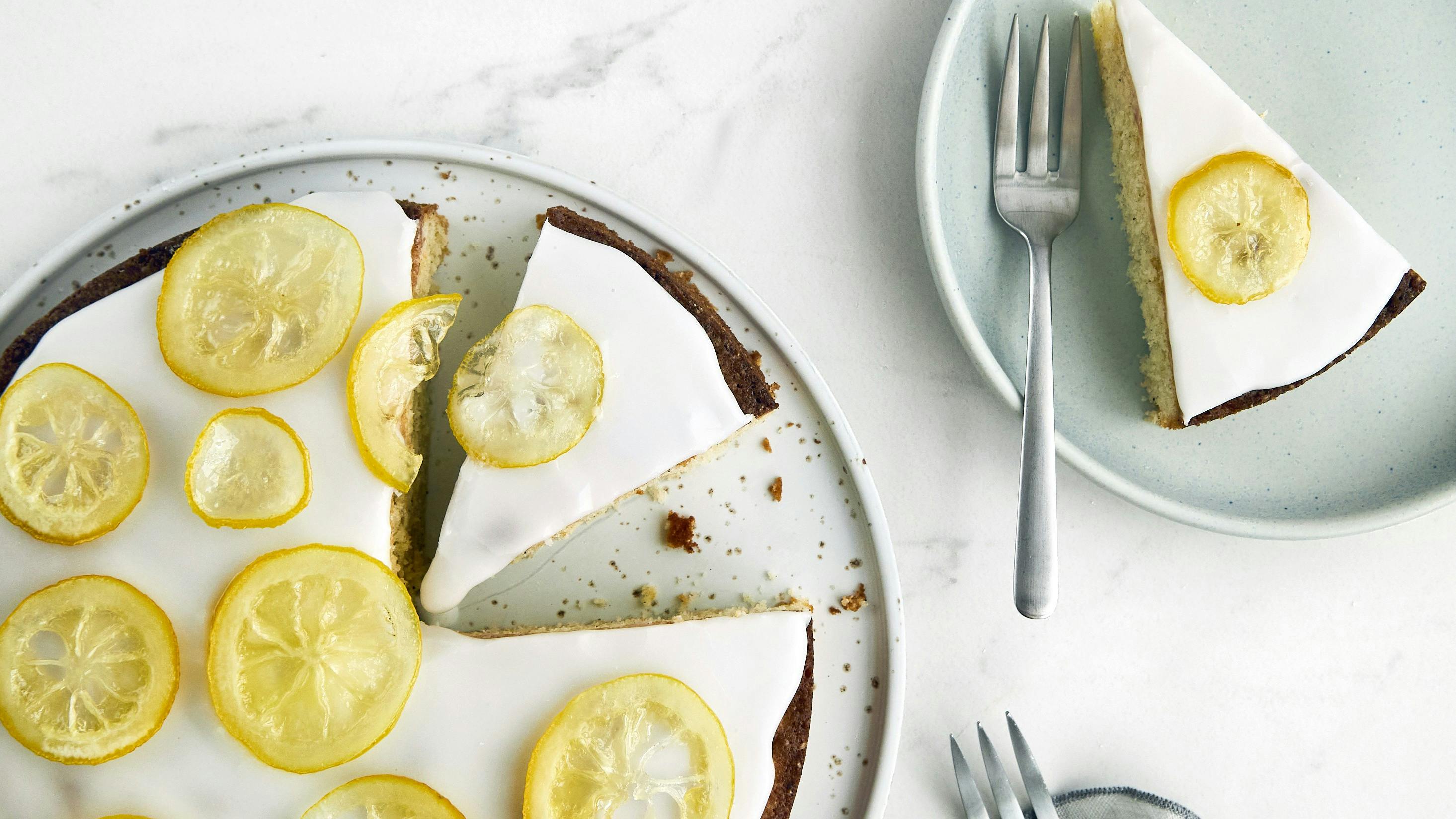 Svampet citronkage med hjemmelavede sukkercitroner og koldskålsglasur