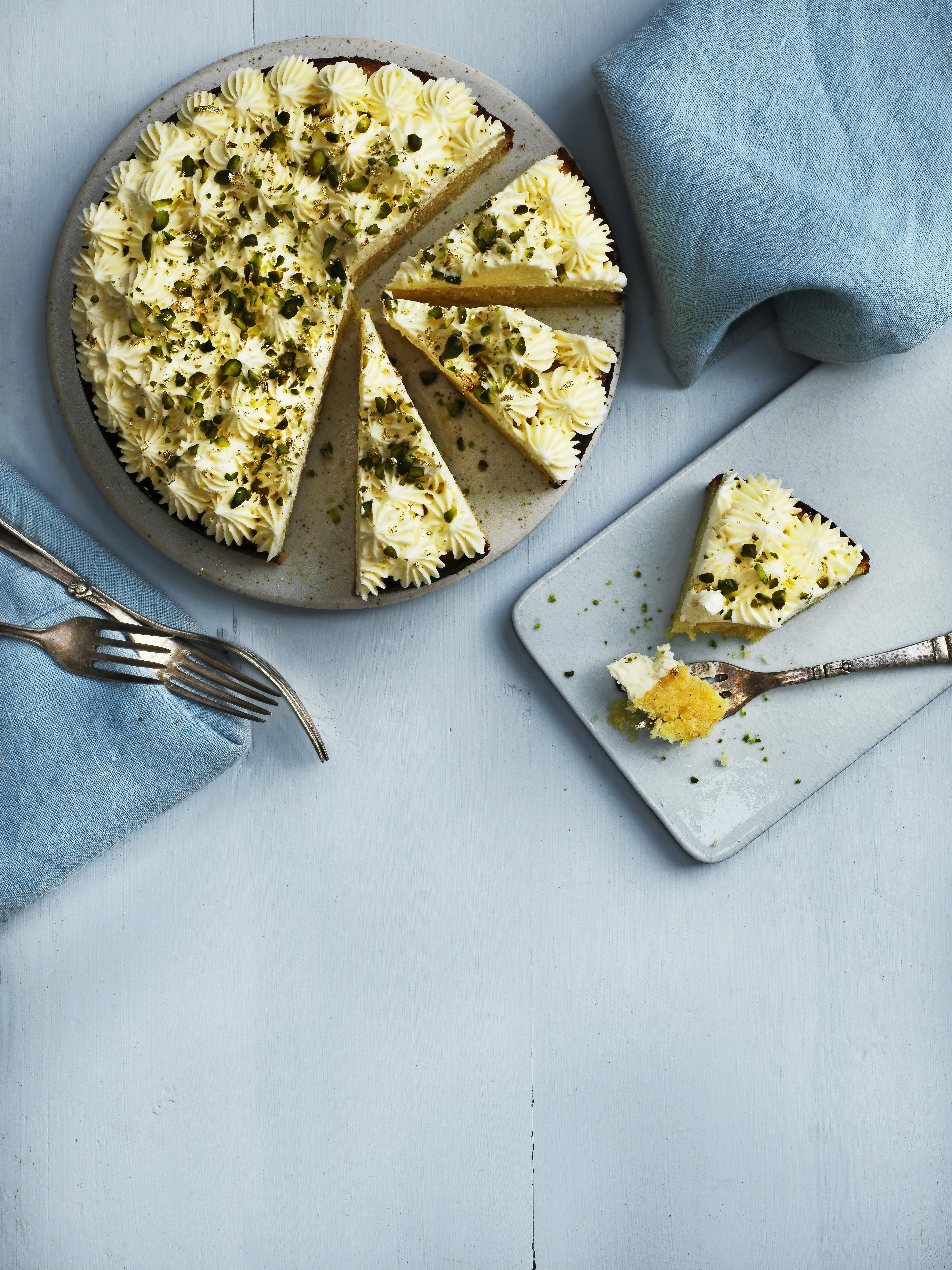 Hvad siger du til en lækker og syrlig kage? Her får den klassiske mazarin selskab af både citronfrosting og knasende pistacienødder.