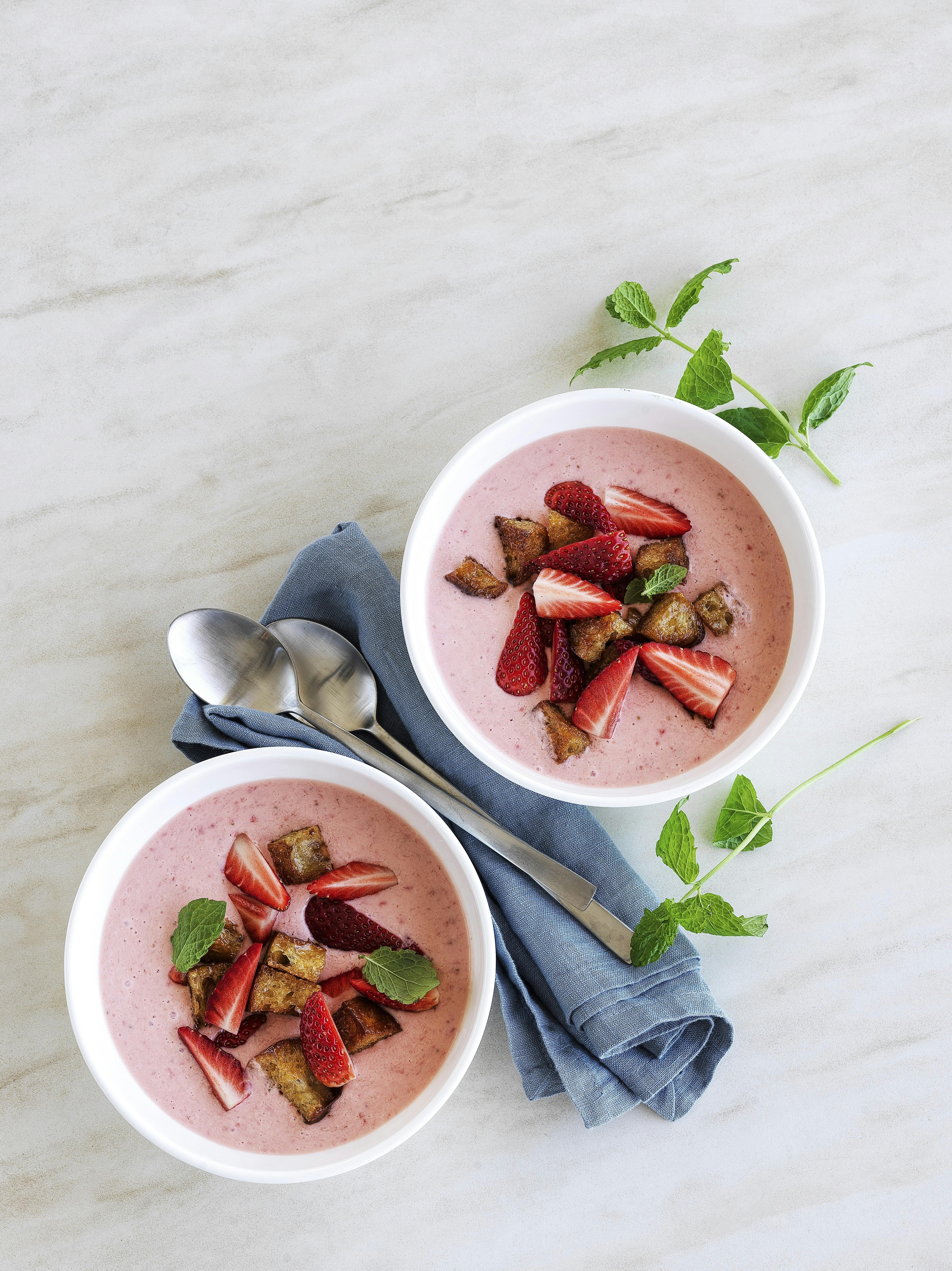 Gratis og sommerfrisk opskrift: Jordbærkoldskål med honning-croutoner