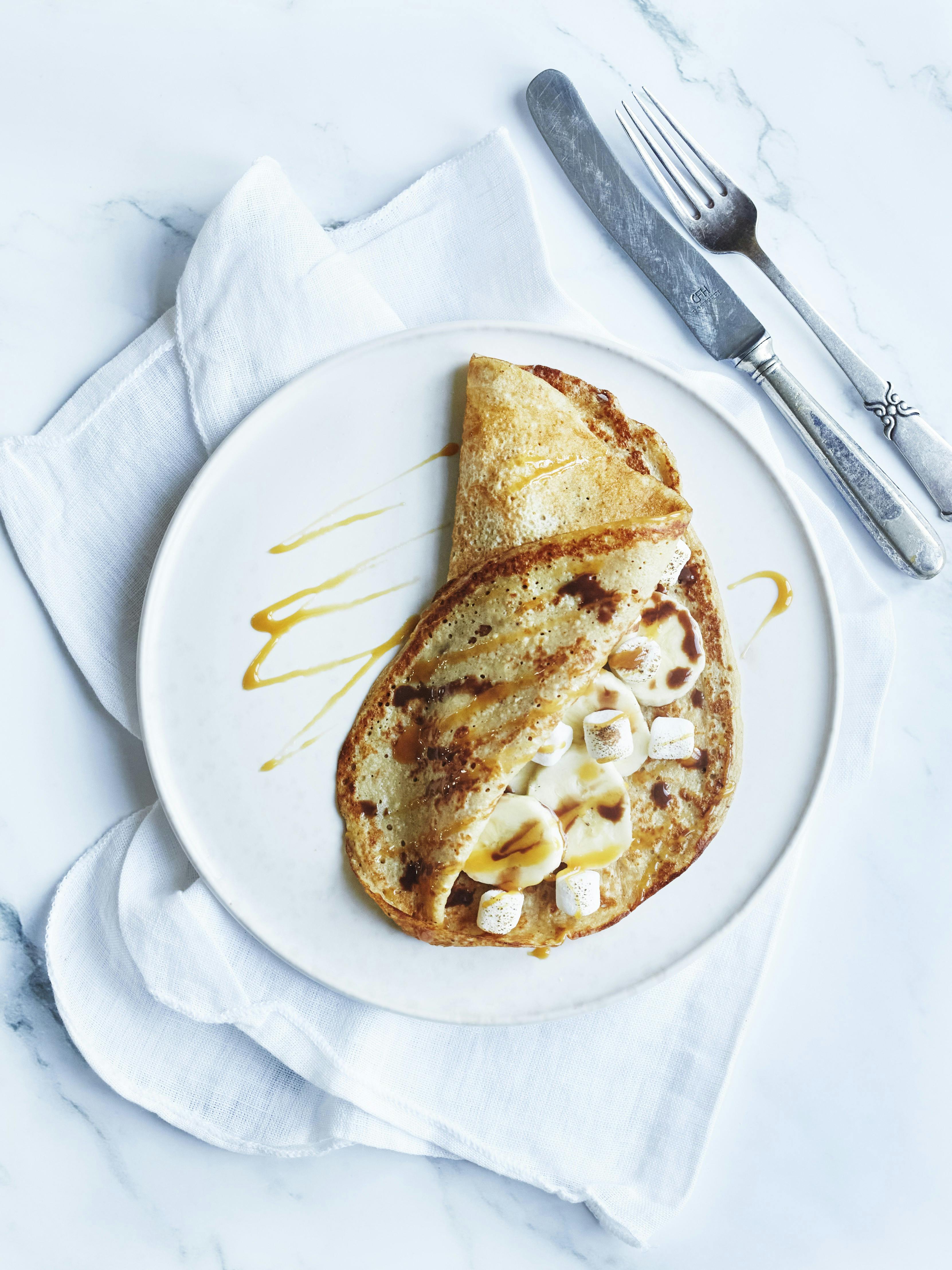 Havre-crepes med banan, skumfiduser og karamelsauce
