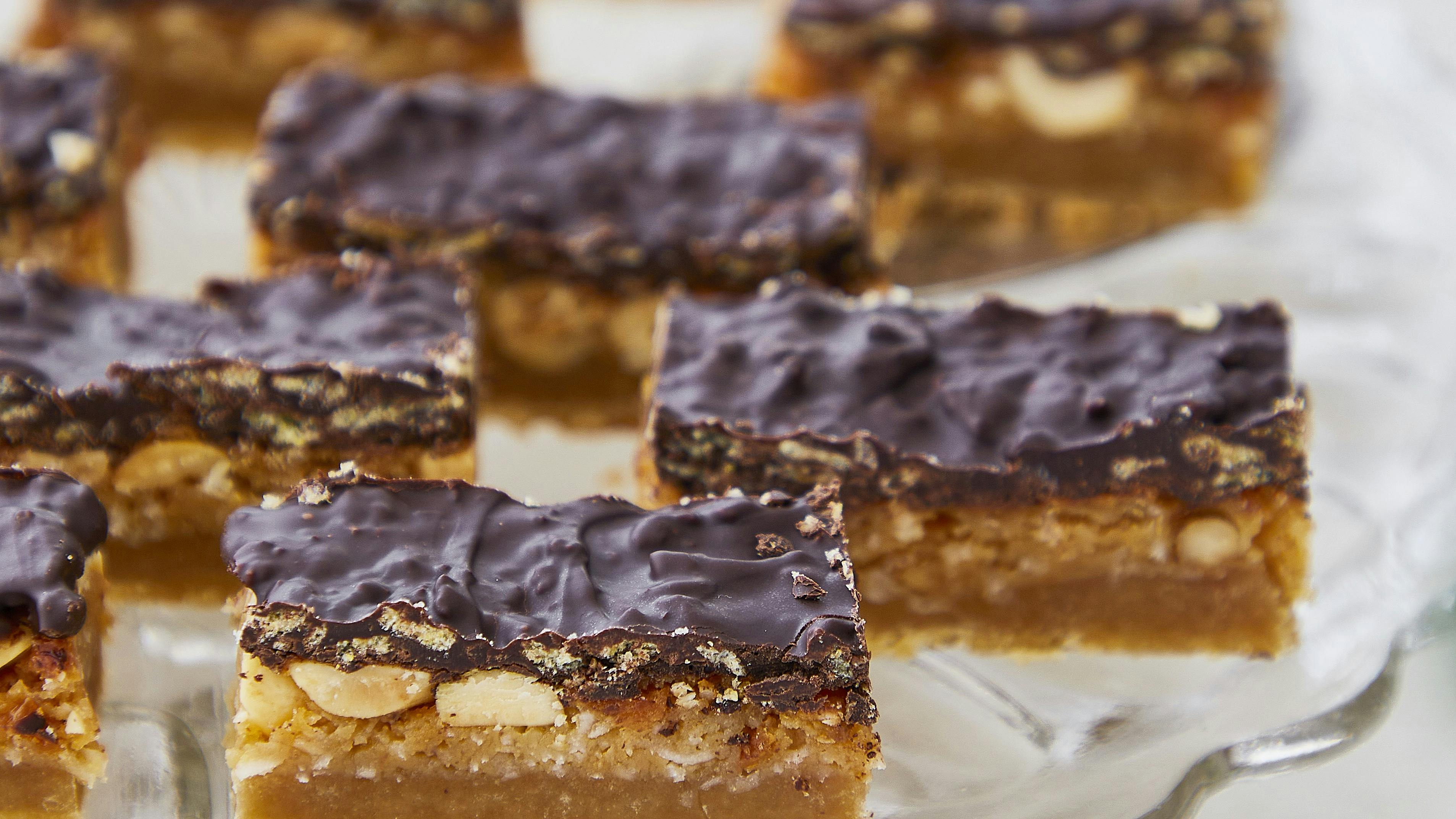 Nydelse i hver bid! Disse karamelsnitter indeholder en himmelsk kombination af karamel, chokolade og en sprød bund.
