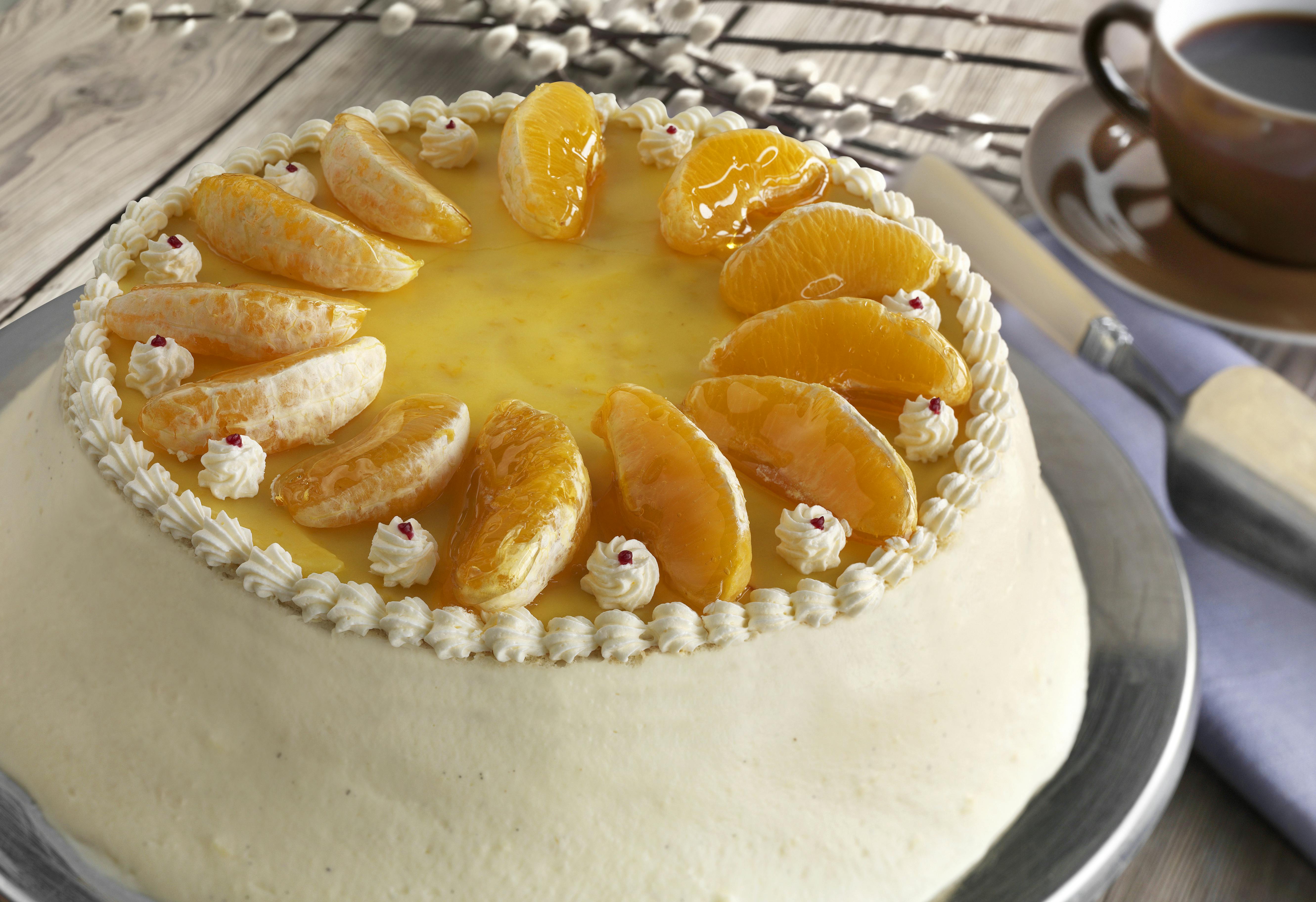 Flot lagkage bygget op af en makronbund med hindbærmarmelade og to lagkagebunde. Kagen er lagt sammen med en vanilje-appelsincreme, og på toppen er den pyntet med en smuk appelsinglasur, flødeskum og appelsinfileter.