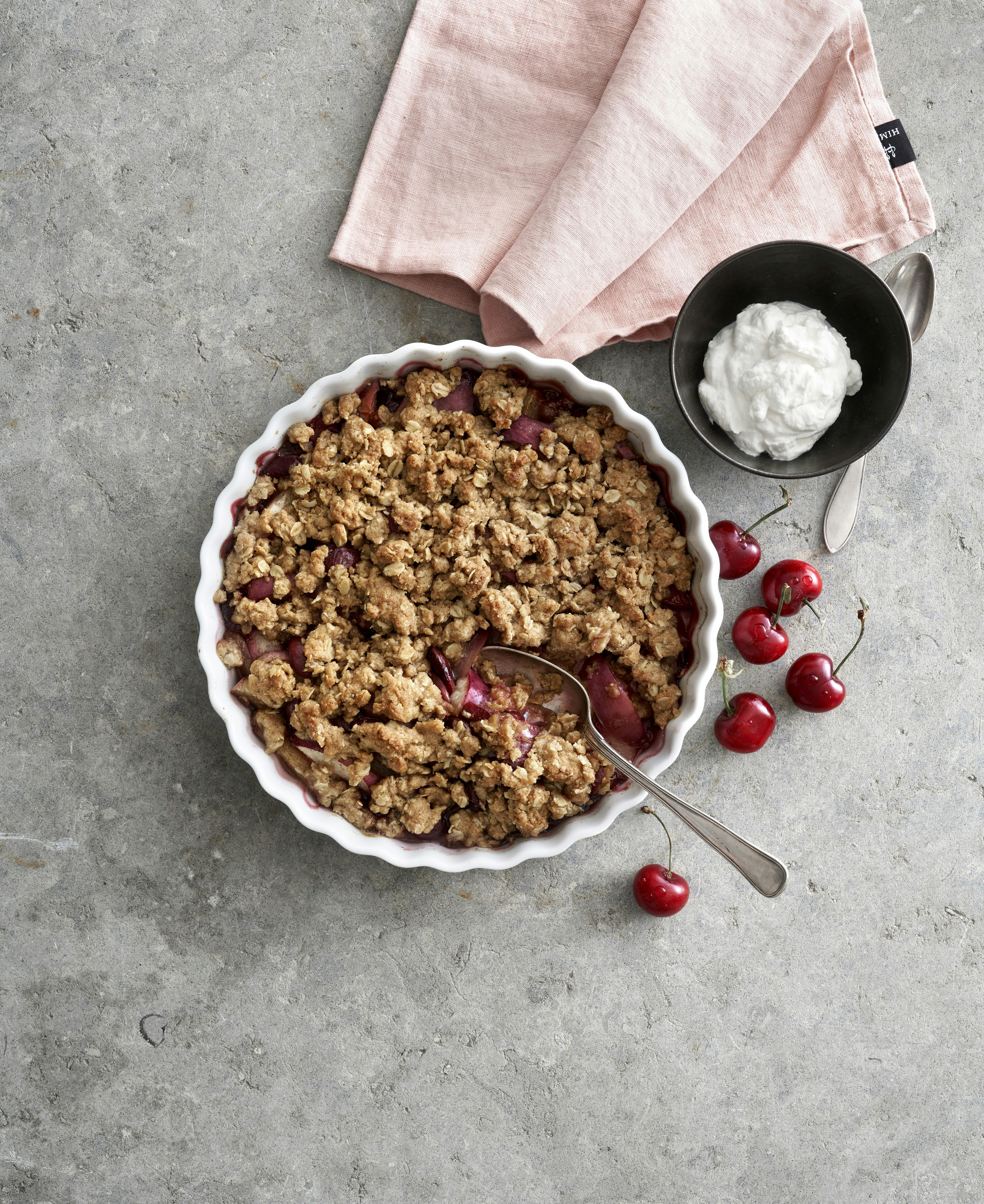 Opskrift på sød crumble-dessert: Sommercrumble med stenfrugt og kirsebær