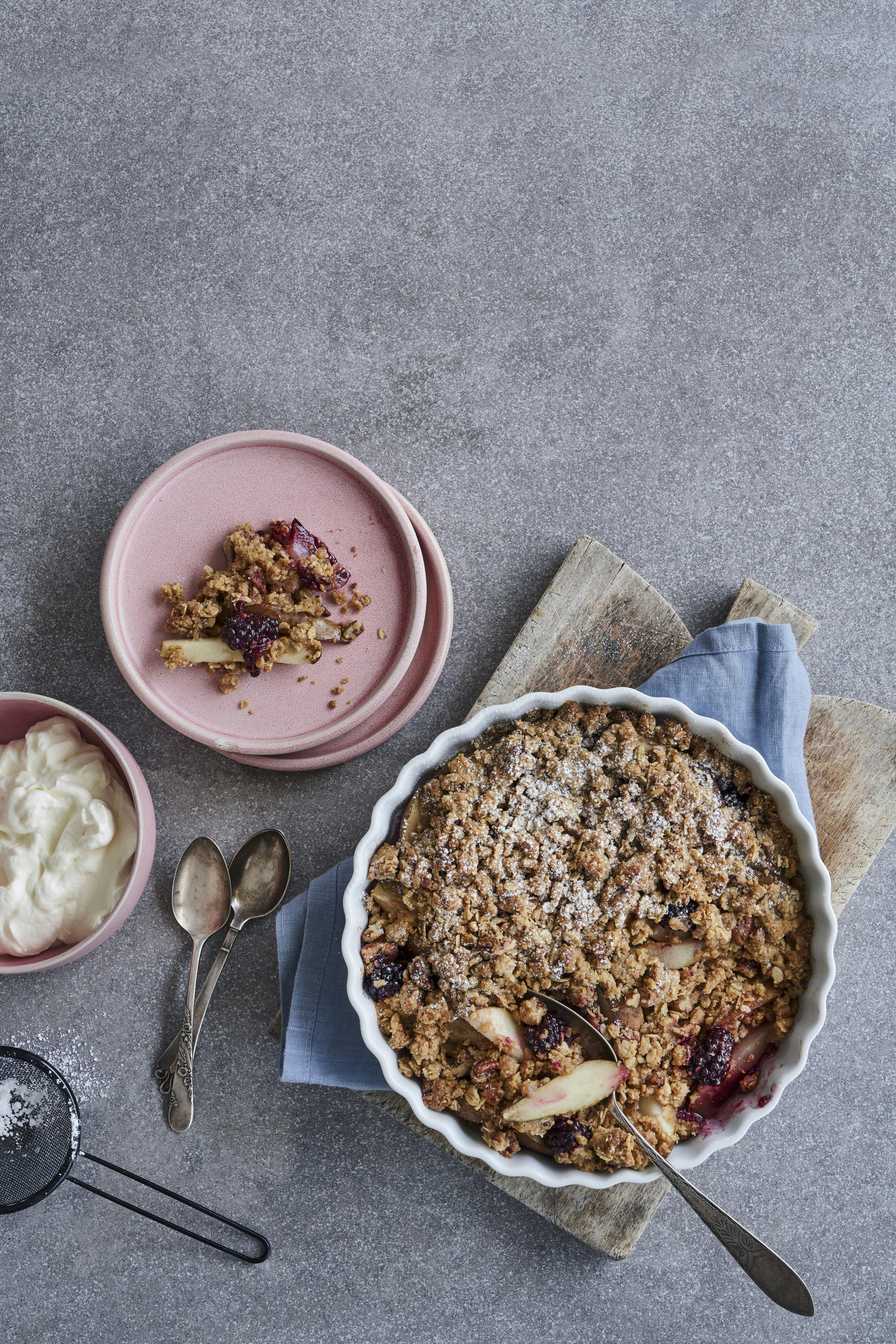 Opskrift på sød efterårsdessert: Pærecrumble med brombær og flødeskum