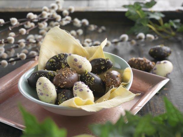 Her får du tre opskrifter på påskeæg dyppet i hvid, lys eller mørk chokolade. Du kan lave dem med smag af appelsin, Grand Marnier, rom eller nougat.