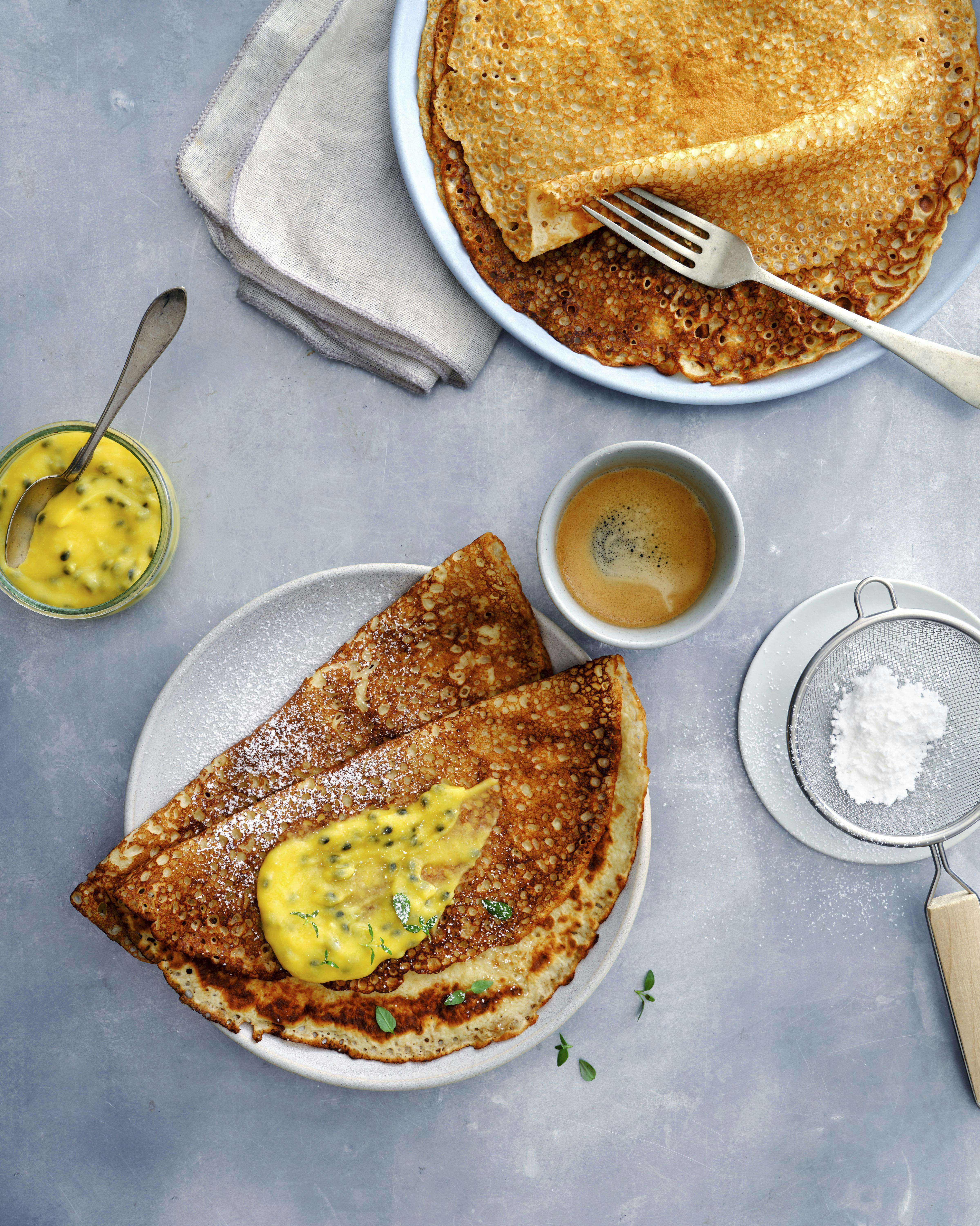 Luftige pandekager toppet med syrlig-sød lemoncurd – en perfekt kombination!