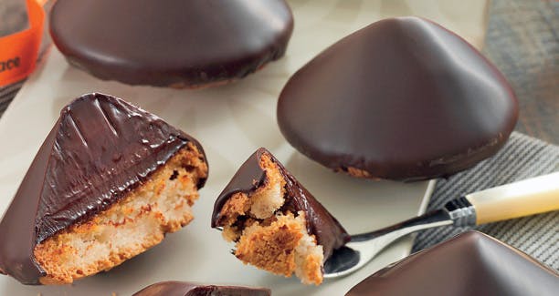 Lækker konditorkage fra Conditori La Glace: en makron toppet med chokoladecreme og overtrukket med mørk chokolade. Værsgo - en lækker Sarah Bernhardt.