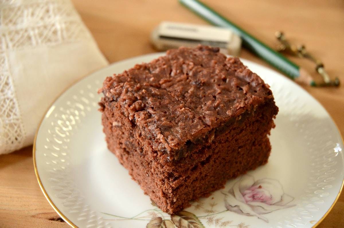 En lækker skærekage med kakao toppet med en dejlig glasur med smag af kaffe, vanilje og kokos.