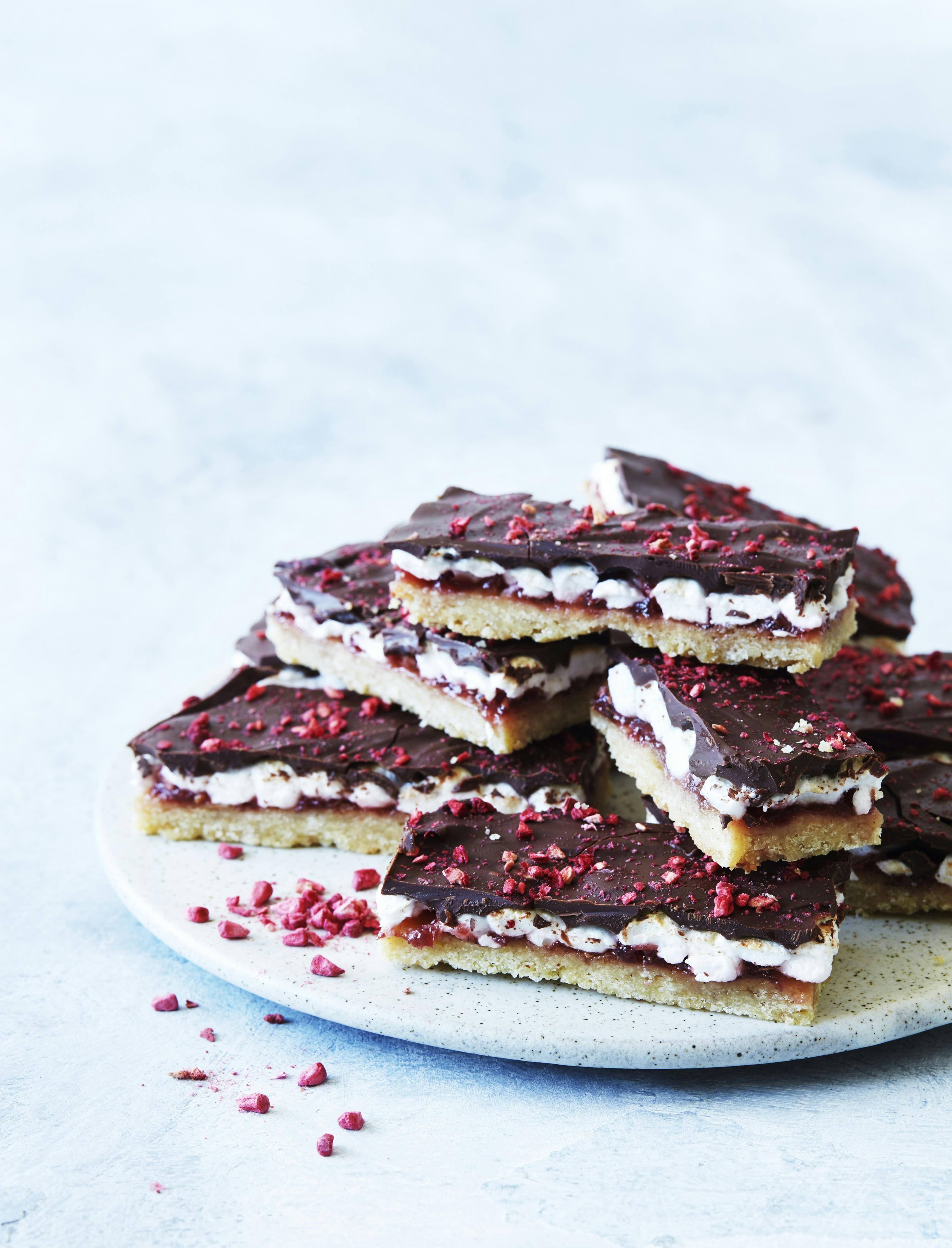 Skumfidussnitter med hindbær og mørk chokolade