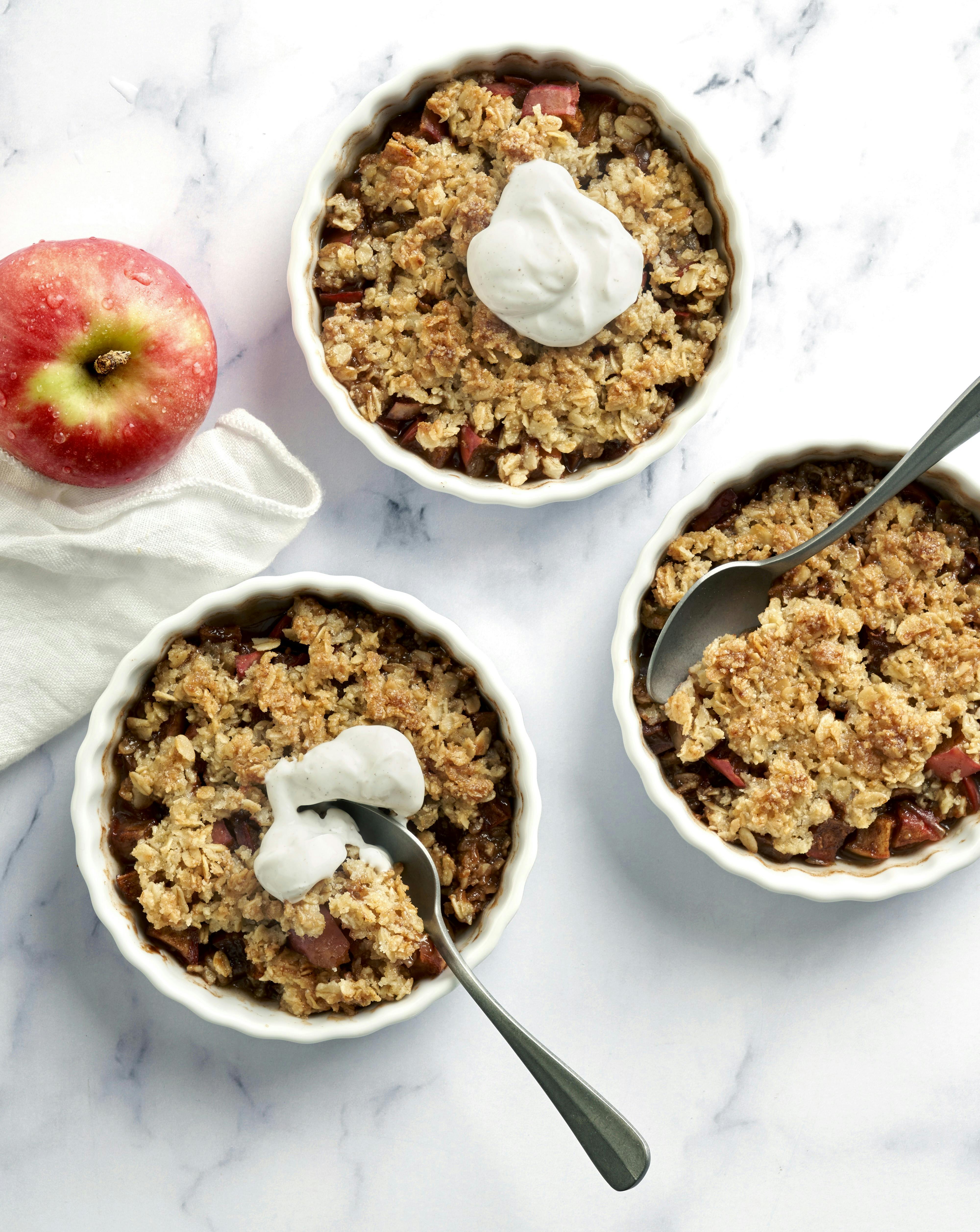 Lækre små æblecrumbles serveret med cremet vaniljeskyr – en perfekt kombination af sødt og friskt.