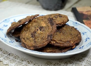 Disse lækre småkager med peanuts og mørk chokolade er særdeles nemme at lave. Og dejen kan du røre sammen, længe før kagerne skal bruges. Opbevar den blot på køl, så kan du bage ved passende lejlighed.