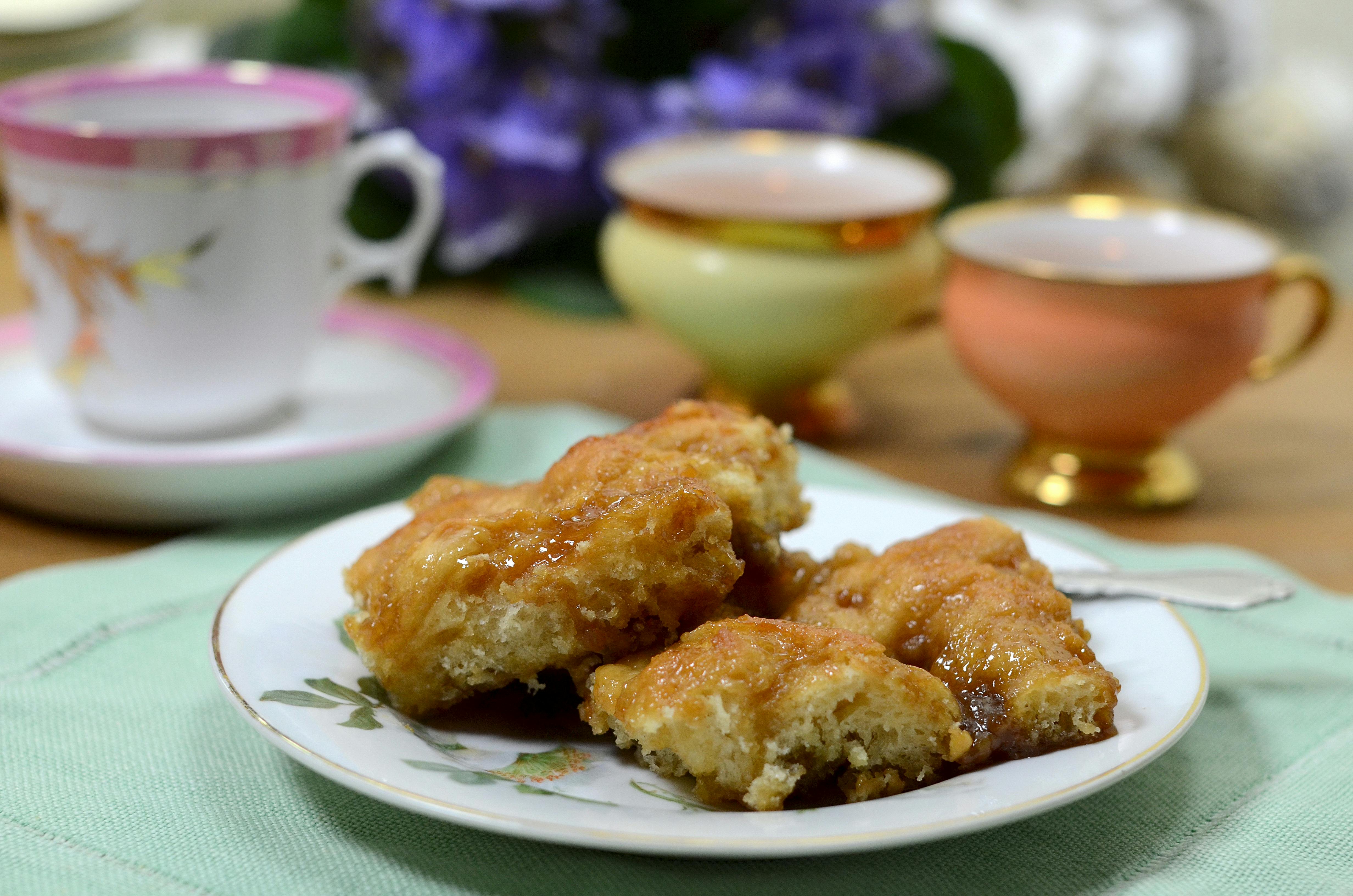 Snasket hjemmebagt brunsviger bagt i gær med topping af smør, sirup og rørsukker