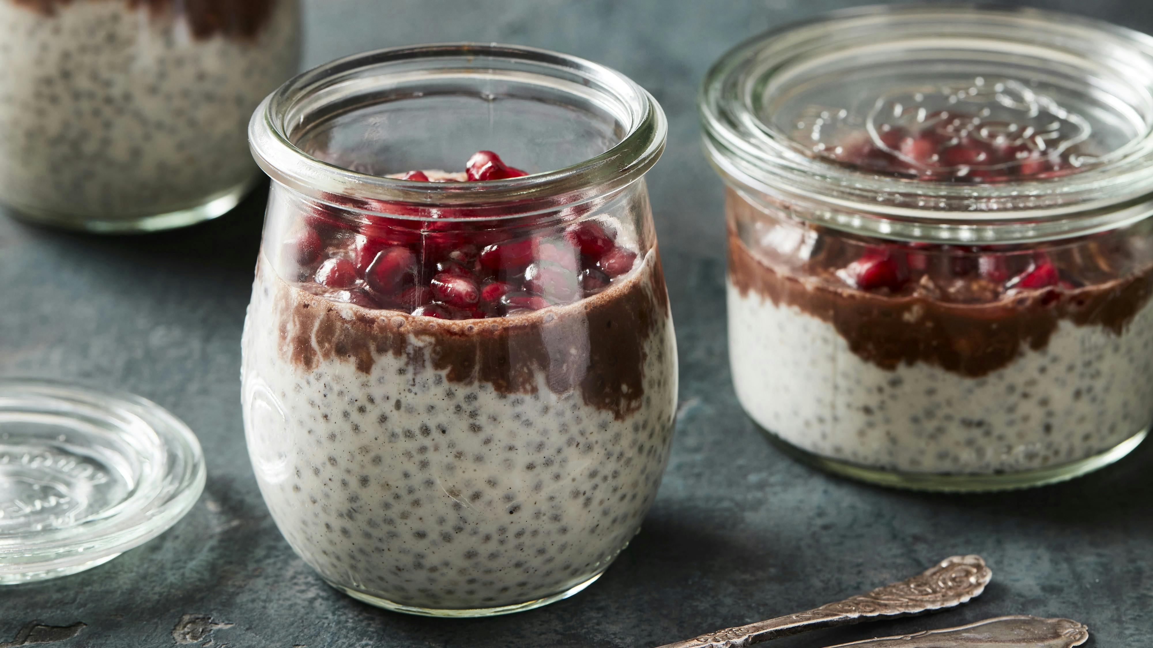 Prøv denne lækre og nærende tofarvet chiagrød med kokos og kakao. Perfekt til en sund og mættende måltid.
