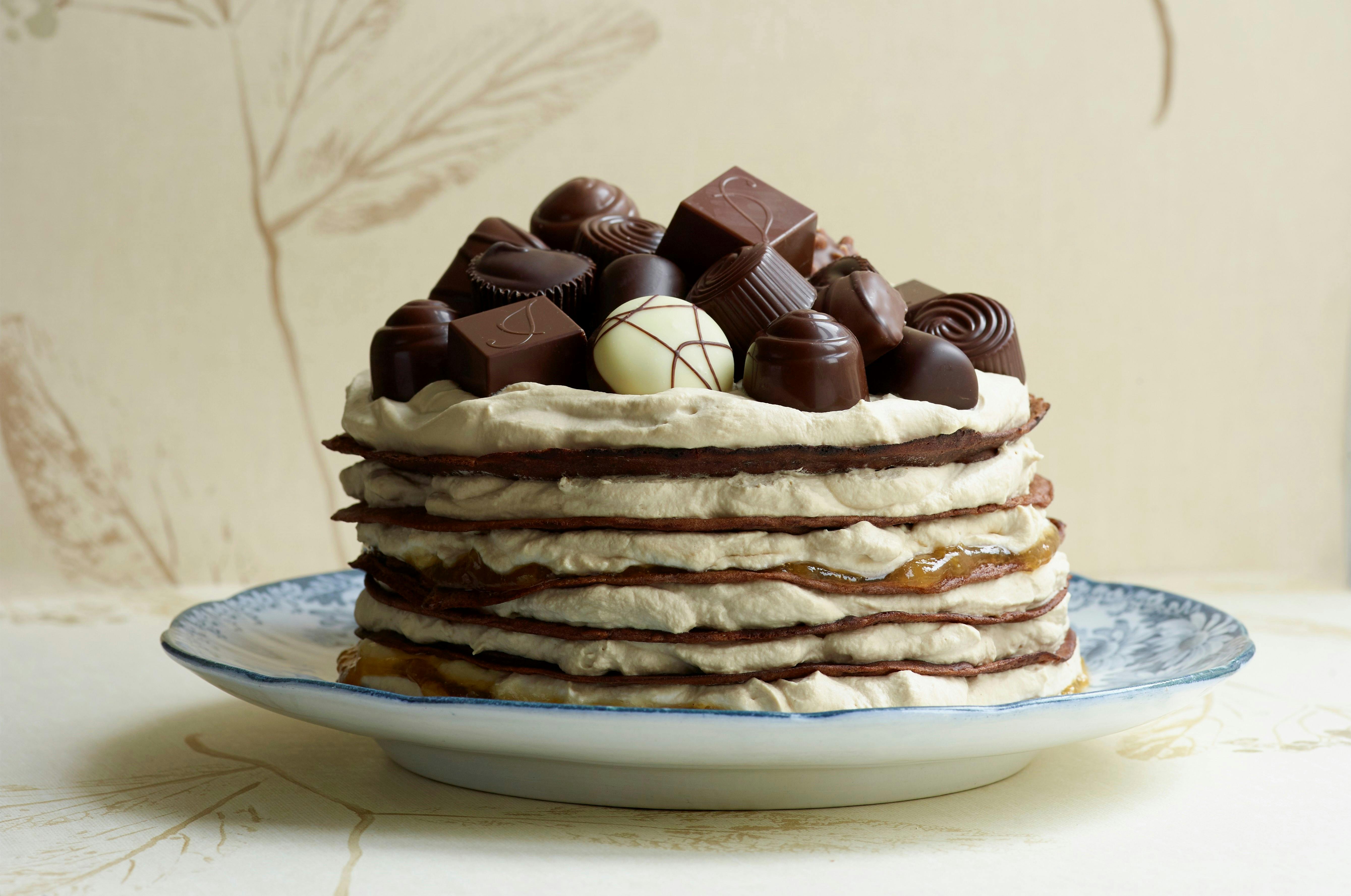 Imponér dine gæster med denne pandekagelagkage, der er lavet af chokoladepandekager og kaffecreme.