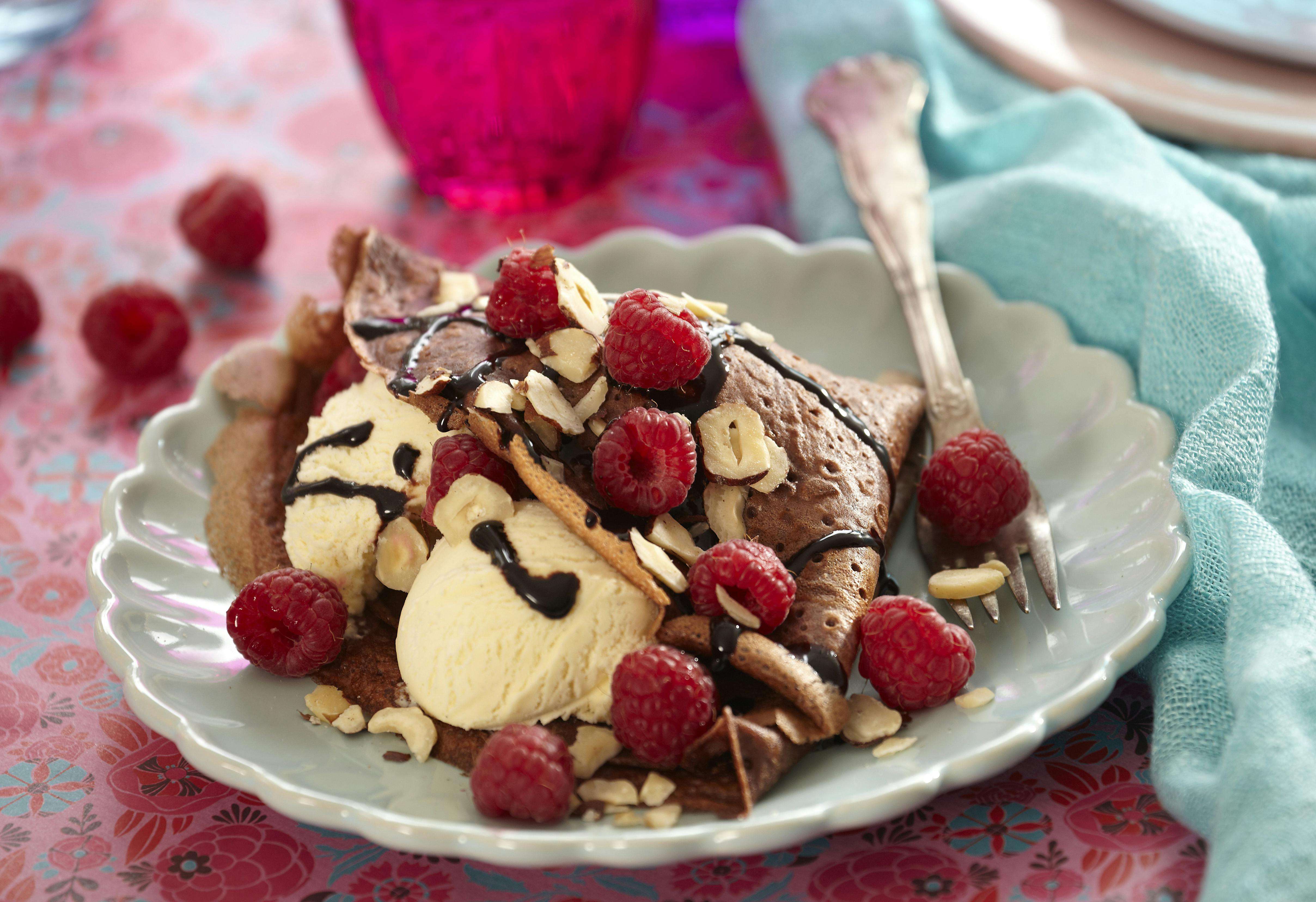 Flot dessert af kakao-pandekager, der arrangeres med vaniljeis, hindbær og hasselnødder.