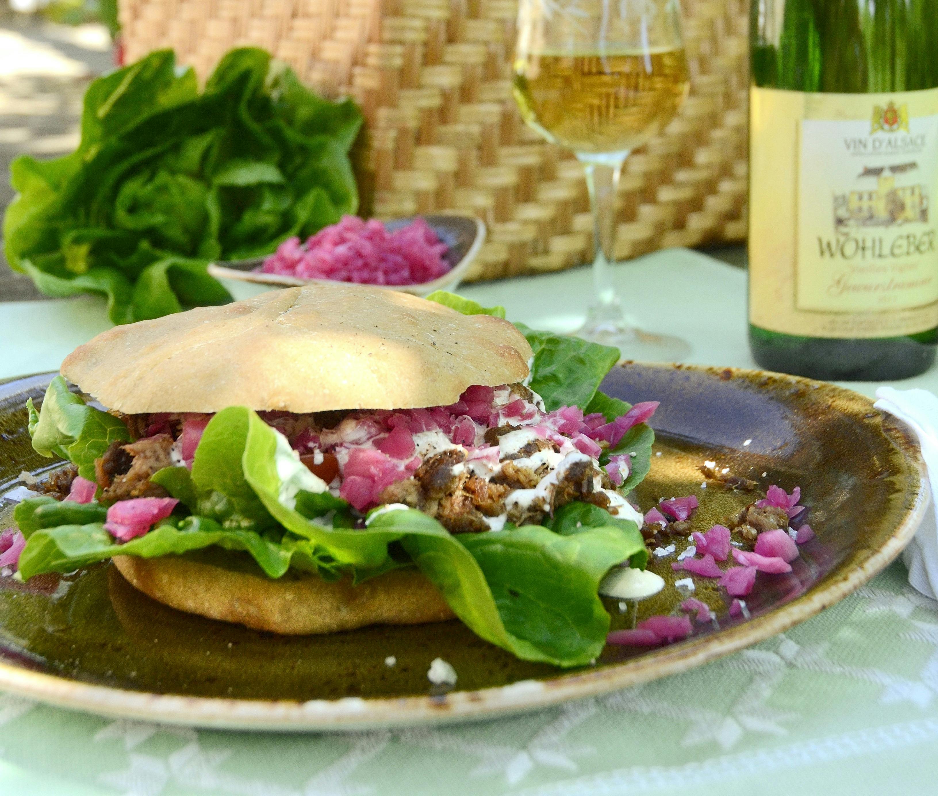 Sandwich fyldt med braiseret lammekød, syltede rødløg, salat og tomater - god både til påske eller skovturen til sommer.