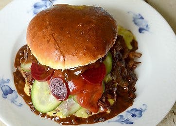 Lone Landmands lækre opskrift på en luksusudgave af den kendte bøfsandwich. Bøffen er tilberedt af hakket krondyrkød, og den serveres i en fin og luftig, hjemmebagt bolle sammen med ristede løg, syltede agurker og rødbeder og en helt fantastisk løgsauce.