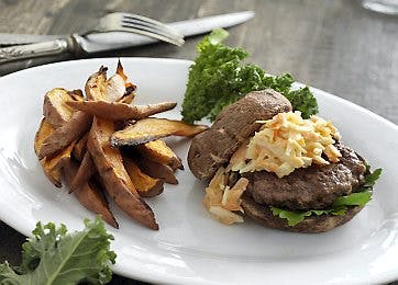 Burger med coleslaw og stegte, søde kartofler til Dukan-kuren er et mættende og lækkert aftensmåltid, hvor den traditionelle hvide bolle er erstattet af en stor portobello-svamp.