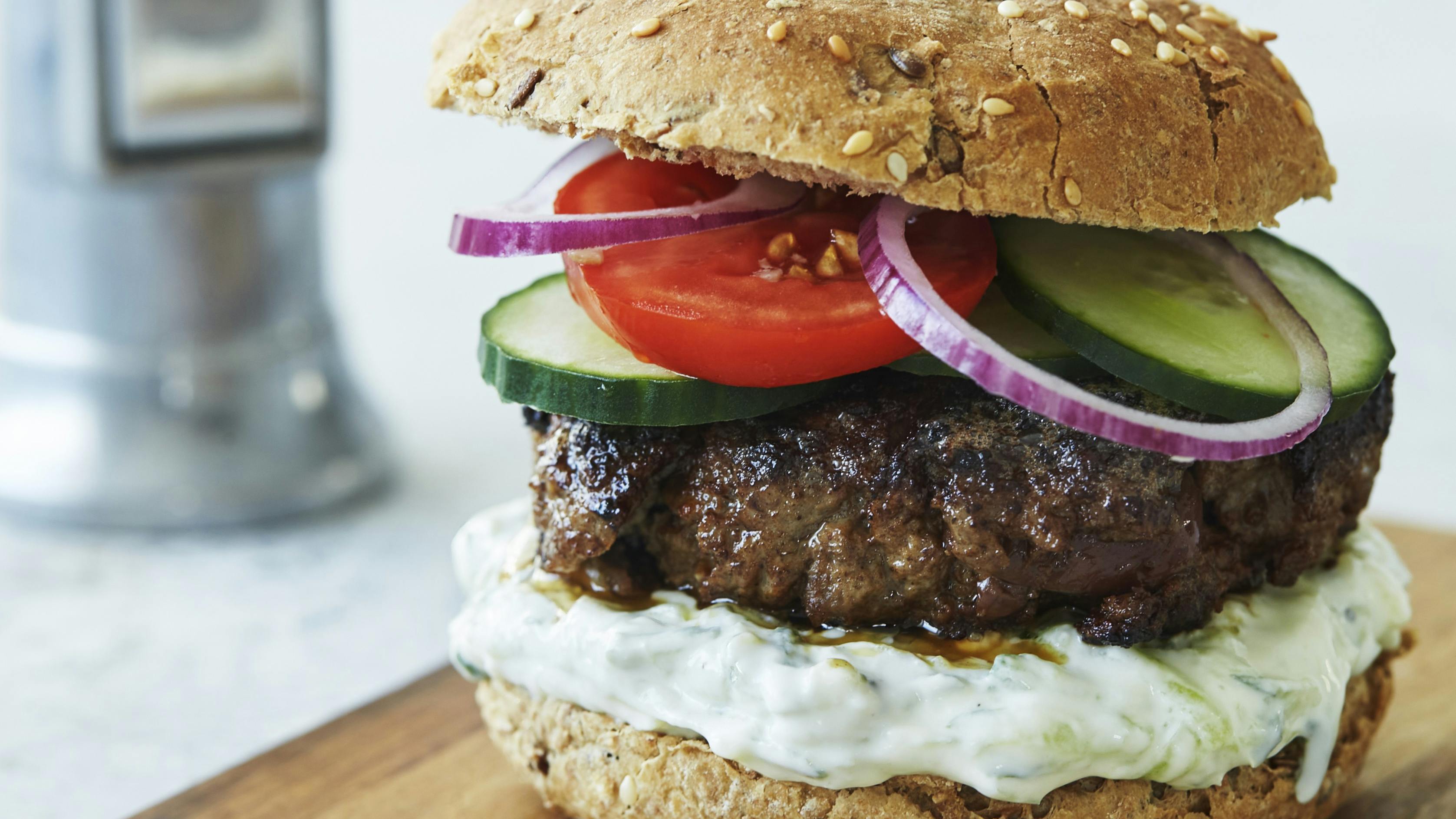 Drøm dig til Grækenland med disse lækre, saftige burgere. Du serverer dem med en velsmagende tzatziki, der er utrolig nem at lave.