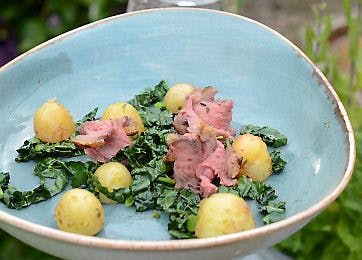Culottesteg er en rigtig dejlig udskæring med masser af smag. Her er den forvarmet i vand, hvilket betyder, at den kun skal have kort tid på grillen, og det bliver lettere at få stegen ensartet rosastegt.
