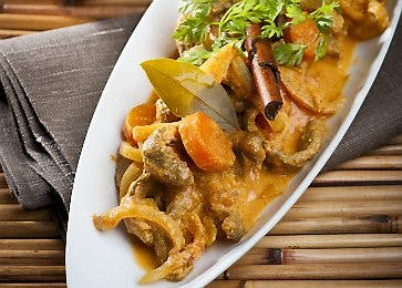 En dejlig gryderet til efterår og vinter. Det lækre kalvekød er krydret med kanel, laurbærblade og karry.Kalvekødet kan erstattes af kalkun- eller svinekød.