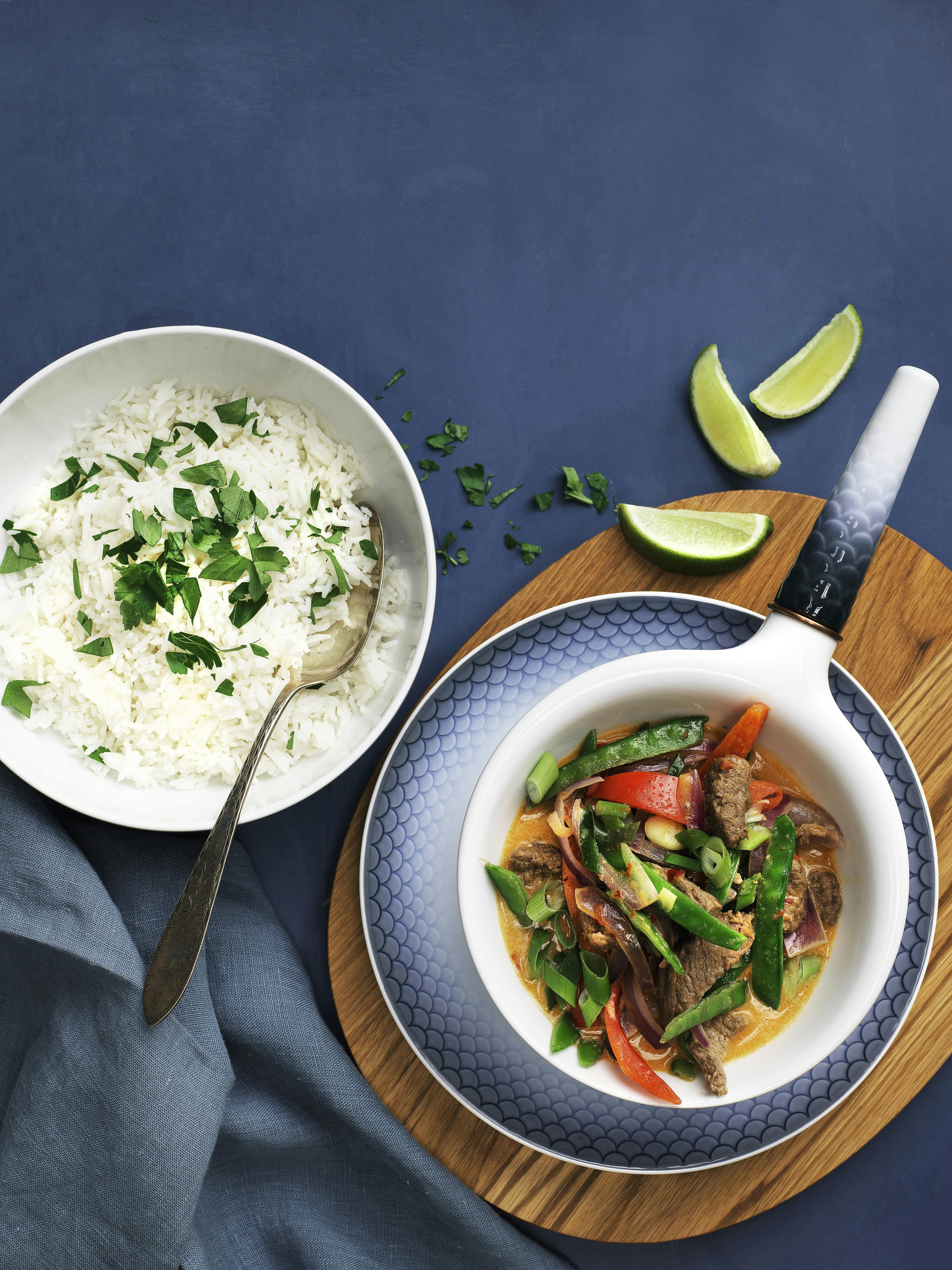Krydret og cremet aftensmad fra det thailandske køkken: Oksekød i rød karry