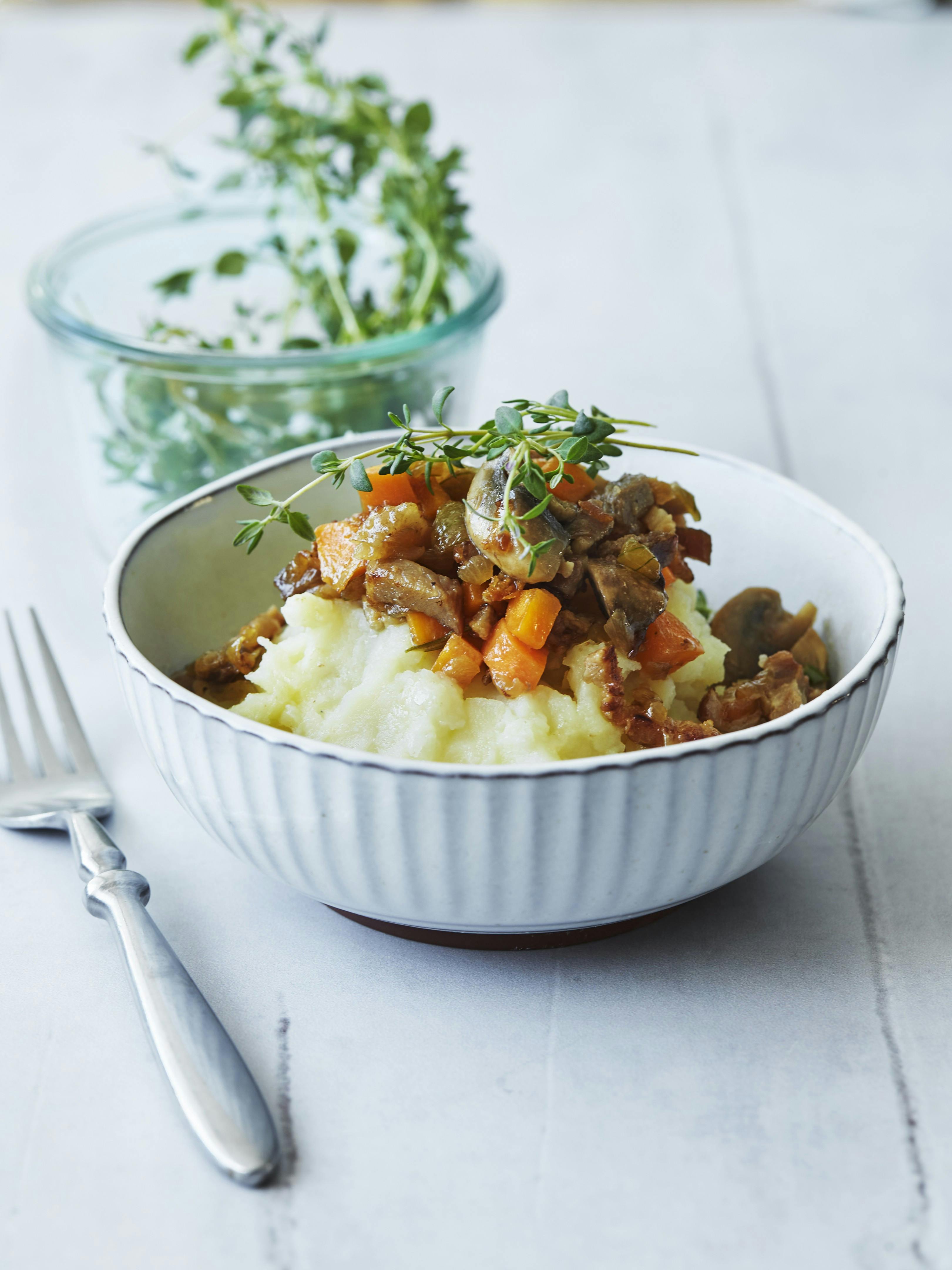 Prøv denne lækre opskrift på brændende kærlighed med svampe. En dejlig blanding af cremet kartoffelmos og saftige svampe, der smager af hjemmelavet hygge.